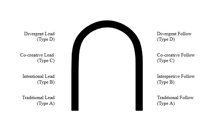 Communication through connection point(s) are primarily one direction flowing from leader initiation to follower response. The lead takes responsibility for initiating every aspect of the follow, including connection, posture, and movement. The lead will be the primary driver of the dance, and won’t generally create opportunities for follower freedom or interpretation.